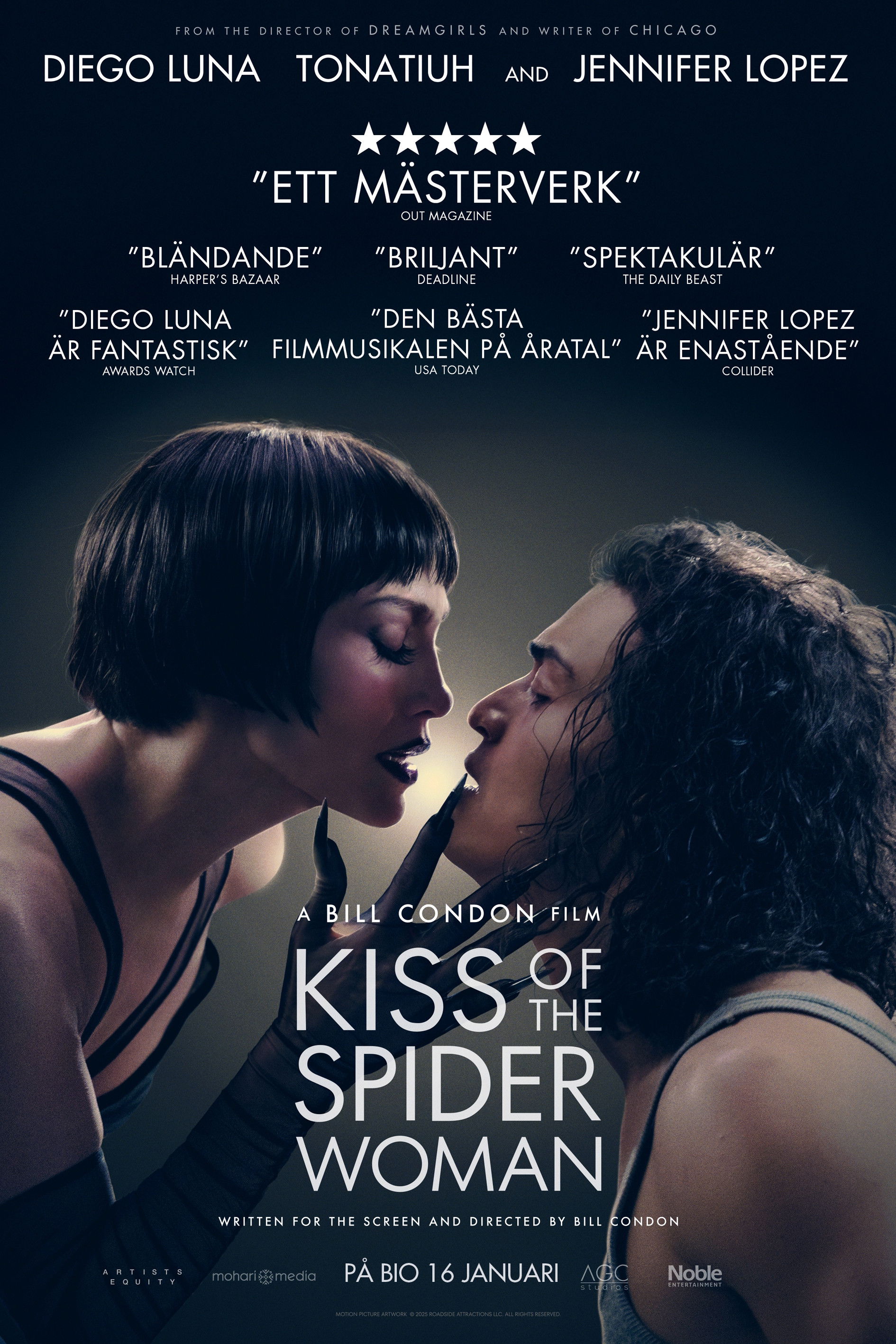 Manuel Puig’in ünlü romanını temel alarak sahnelenen ve Broadway’i kasıp kavuran Kander & Ebb müzikalinin sinema uyarlaması, üç başrol oyuncusunun olağanüstü performanslarıyla dikkat çekiyor: filme adını veren rolde Jennifer Lopez, Diego Luna ve Tonatiuh. Örümcek Kadının Öpücüğü, siyasi mahkûm Valentin ile aynı hücreyi paylaşan, ahlâka aykırı davranıştan hüküm giymiş Molina’nın sıradışı dostluklarını anlatıyor. Molina Valentin’e, bayıldığı film yıldızı Ingrid Luna'nın başrolünü oynadığı şatafatlı bir Hollywood müzikalinin hikâyesini anlatıyor; küçük, karanlık hücreleri böylece ışıl ışıl canlanıyor. Bu sahnelerde Technicolor renk tonları ve muhteşem danslarla izleyicinin gözlerini kamaştıran Örümcek Kadının Öpücüğü, The Greatest Showman ve Chicago gibi hit müzikal filmlerin senaryolarını yazan, Dreamgirls’ün de yönetmenliğini üstlenen Bill Condon tarafından beyazperdeye aktarıldı. Film, Sundance’te prömiyerini yaptı ve Locarno Film Festivali'nin kapanış filmi olarak gösterildi.